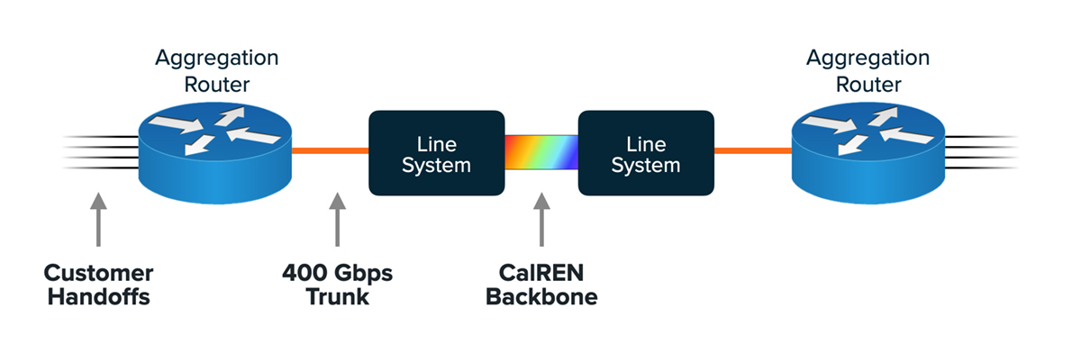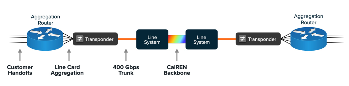 If the benefits of a 400 Gbps backbone are to be enjoyed from end to end, then each step along the path from one lab, classroom, device, display, or other resource to another – customer handoffs to routers, signal aggregation from routers to transponders, data signals from transponders to the CalREN backbone, and the CalREN backbone itself, as shown below – must also be individually capable of transferring data at 400 Gbps.