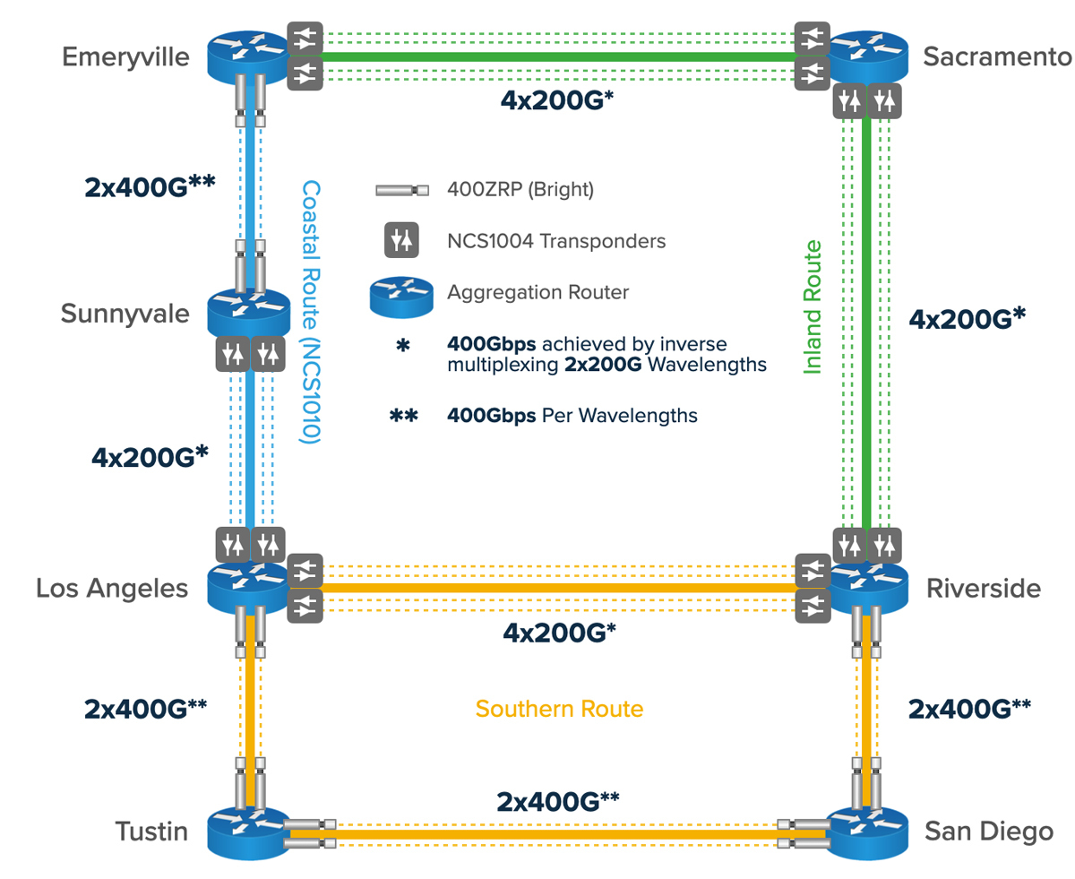During the 2022-23 fiscal year, CENIC upgraded its backbone bandwidth to 400G by deploying sixteen Cisco NCS1004 transponders, with three southern backbone routes running natively at 400 Gbps and others achieving 400 Gbps by inverse-multiplexing of 200G links.