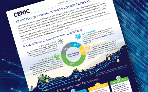 To examine these factors, CENIC is pleased to present the first installment of its California Broadband, Energy, and the Environment Series, examining how middle-mile networks can meet the growing demands of 21st century society while improving their own energy use and enabling energy efficiencies in broadband networks of all kinds.