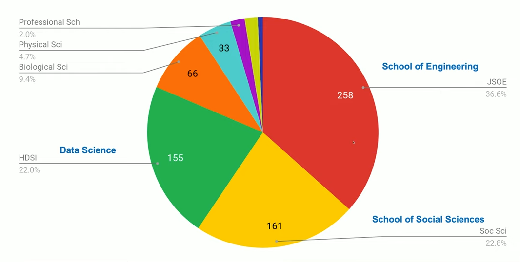 He said the path ahead could also entail exploiting the ongoing transformation of higher education toward the increasing use of data and computing as an essential part of their classroom education. Wuerthwein shared an interesting slide for UC San Diego—which has its own, albeit smaller, version of the NRP—using its platform. He noted the massive growth in use by social science students from academic year 2023 through academic year 2024.