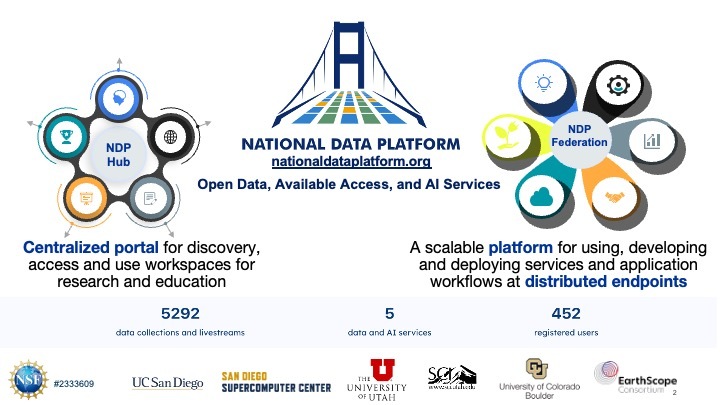 This trend has evolved to include not only the compute and storage resources—CPUs, GPUs, and data storage devices—but the data itself and the services to make use of it in the form of the National Data Platform (NDP), a federated and extensible data ecosystem designed to promote secure collaboration and innovation on top of existing data and cyberinfrastructure, including the National Research Platform (NRP) and CENIC AIR.