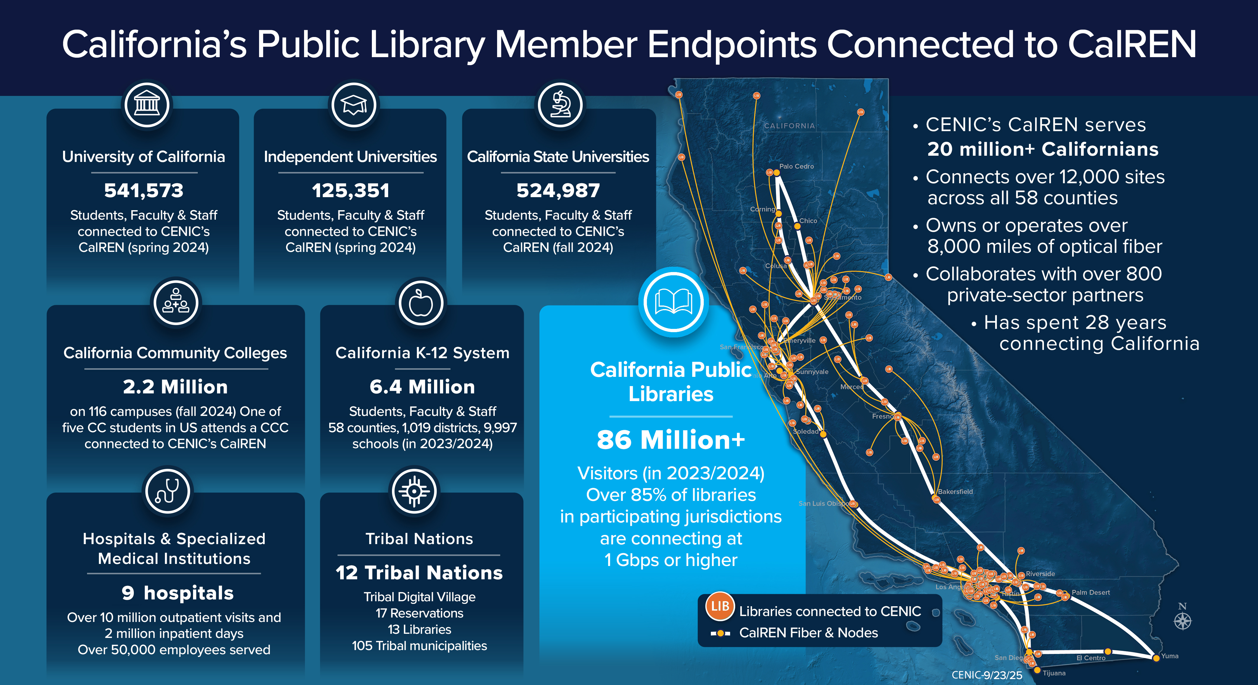 With these improvements, Californians of all ages can trust their libraries to provide a high level of connectivity to online resources worldwide and a robust, best-in-class network path to California K–12 schools, institutions of higher learning, cultural and healthcare institutions, and more.