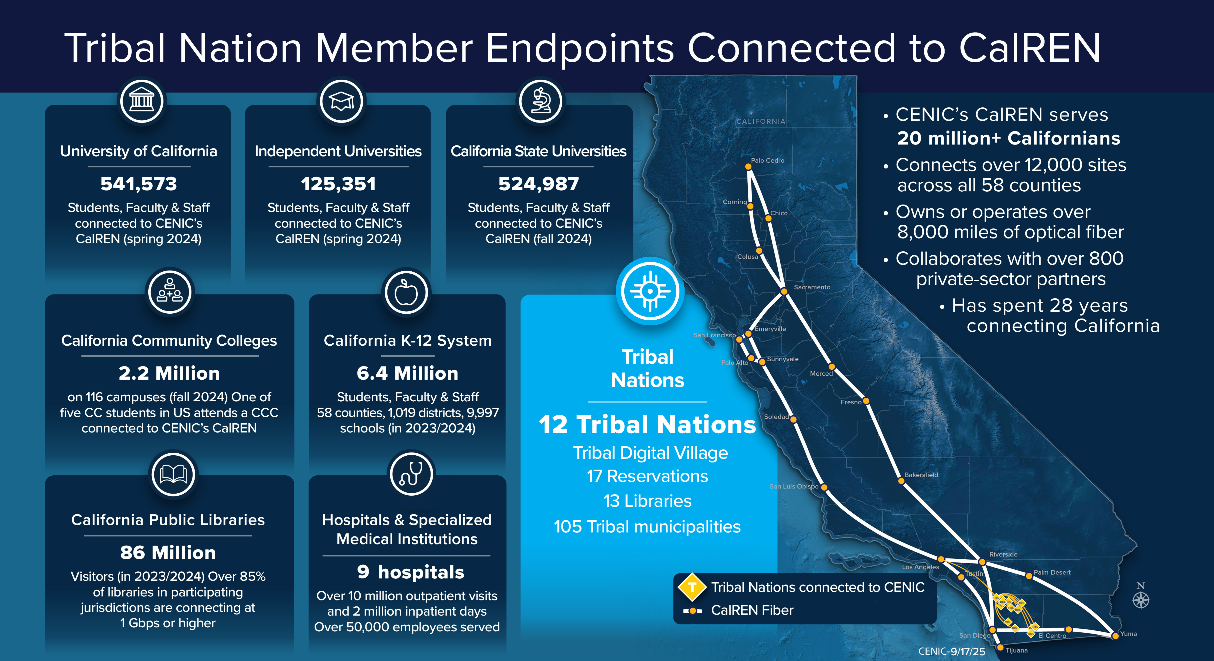 Understanding the benefits of high-speed connectivity and the challenges of connecting many Tribal lands, CENIC works closely with Tribes to understand their specific needs and create solutions that bring opportunities for growth and advancement.