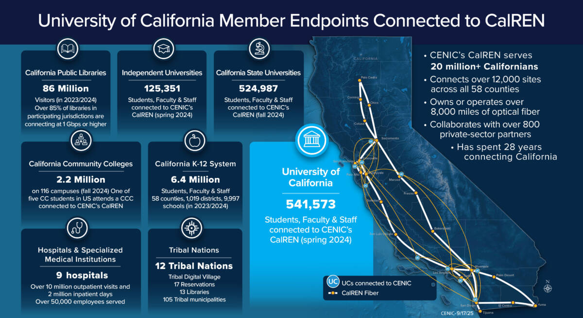 The University of California (UC) system is the most prestigious and accomplished public research and education system in the world, with 71 Nobel Prizes awarded to its faculty and researchers since the creation of the awards in 1901. Its ten campuses, off-campus sites, and supercomputing and medical centers all require best-in-class networking and services to support this level of world-leading achievement, motivating the UC system’s co-founding of CENIC in the mid-1990s.