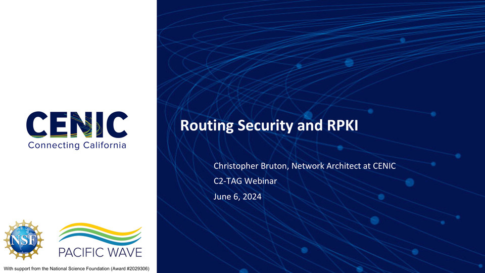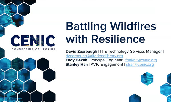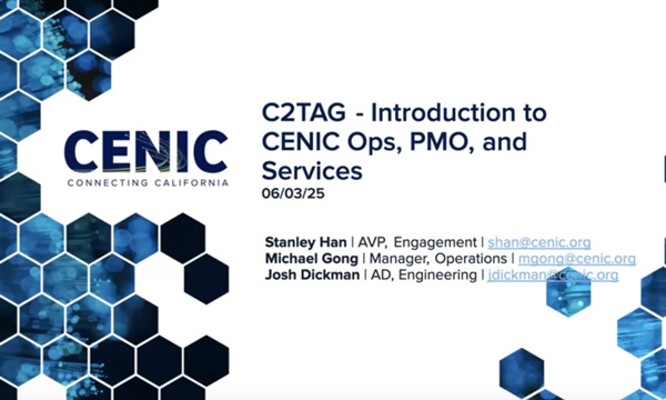 Dennis Cagampan, CENIC’s Director of Engineering, will walks through the evolution of our Network Monitoring Systems, the evaluation process behind selecting Zabbix, and the challenges and successes of the migration. Bryan Barnett, CENIC’s Lead Engineer in Operations, presents a demo of the system, highlighting its capabilities in action. CENIC architects and engineers also do Q&A.